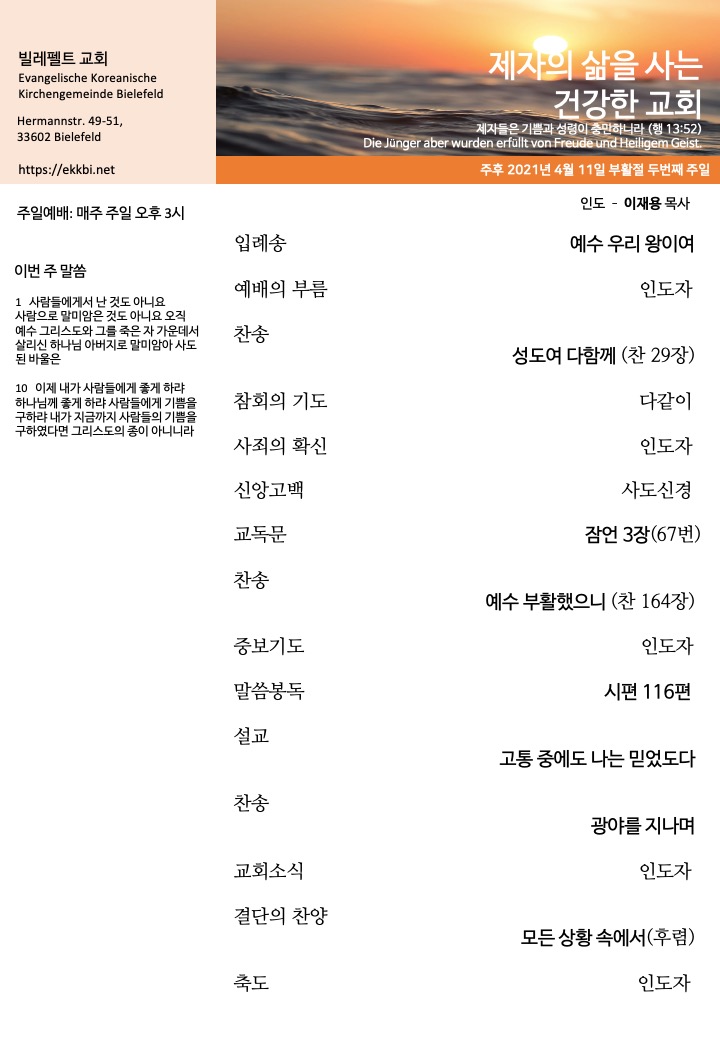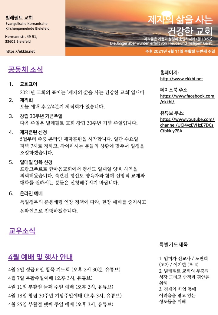 주보 제목2021년 4월 11일 주보입니다2021-04-10 20:48작성자ekkbi1991 목록글쓰기 이전2021년 창립 30주년 기념주일 감사예배 주보입니다.ekkbi19912021-04-17다음2021년 4월 4일 부활주일 주보입니다ekkbi19912021-04-03 Powered by MangBoard | 망보드 스토어