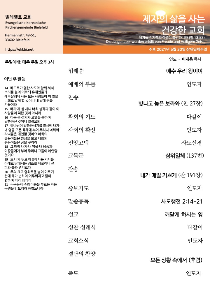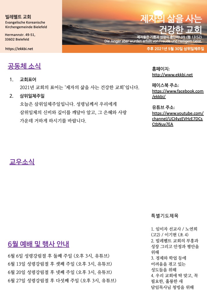 2021년 5월 30일 삼위일체 주일 주보입니다^^ 내일은 온라인으로 성찬을 함께 나눌 예정이니, 오늘 빵과 포도주 (또는 포도주스)를 준비해주시면 좋겠습니다^^