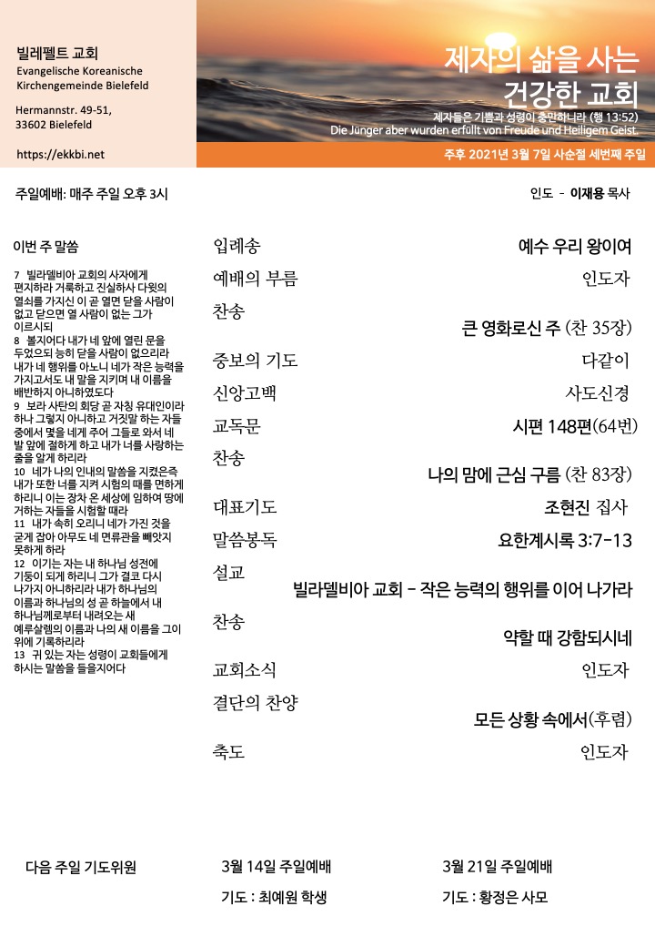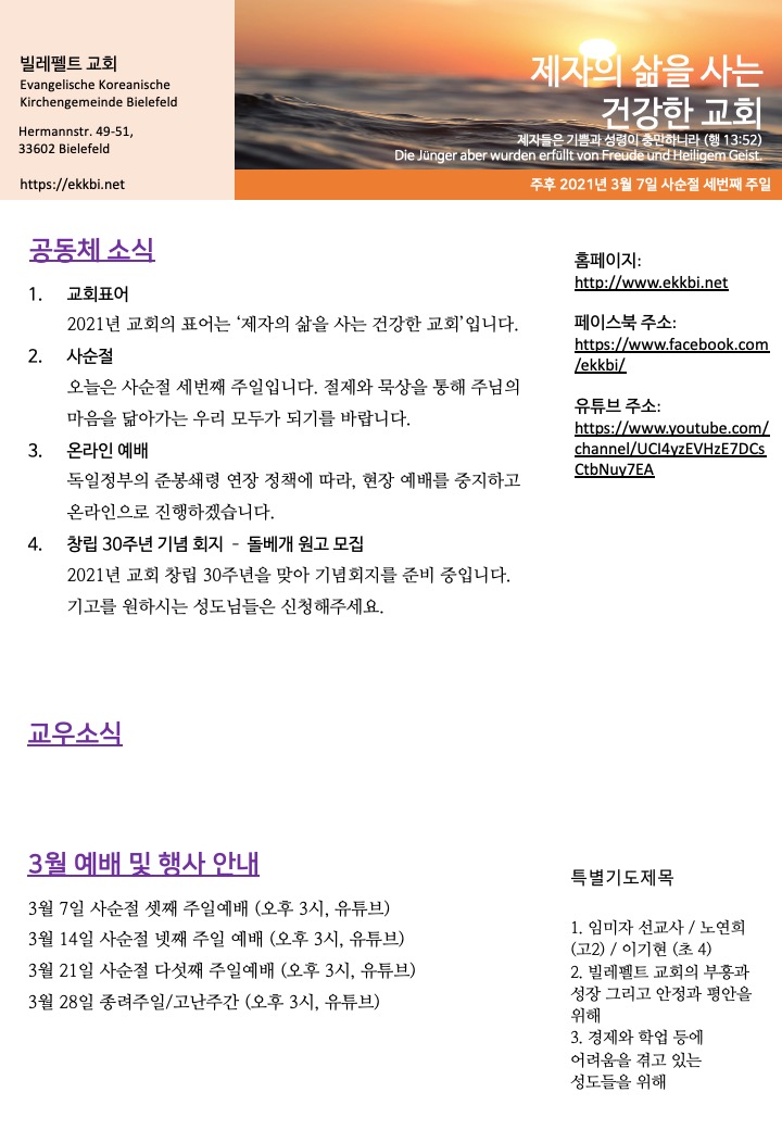 주보 제목2021년 3월 7일 사순절 세번째 주일 주보입니다2021-03-06 20:45작성자ekkbi1991 목록글쓰기 이전2021년 3월 14일 사순절 네번째 주일 주보입니다ekkbi19912021-03-13다음2021년 2월 28일 사순절 두번째 주일 주보입니다ekkbi19912021-02-27 Powered by MangBoard | 망보드 스토어