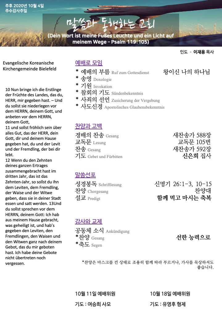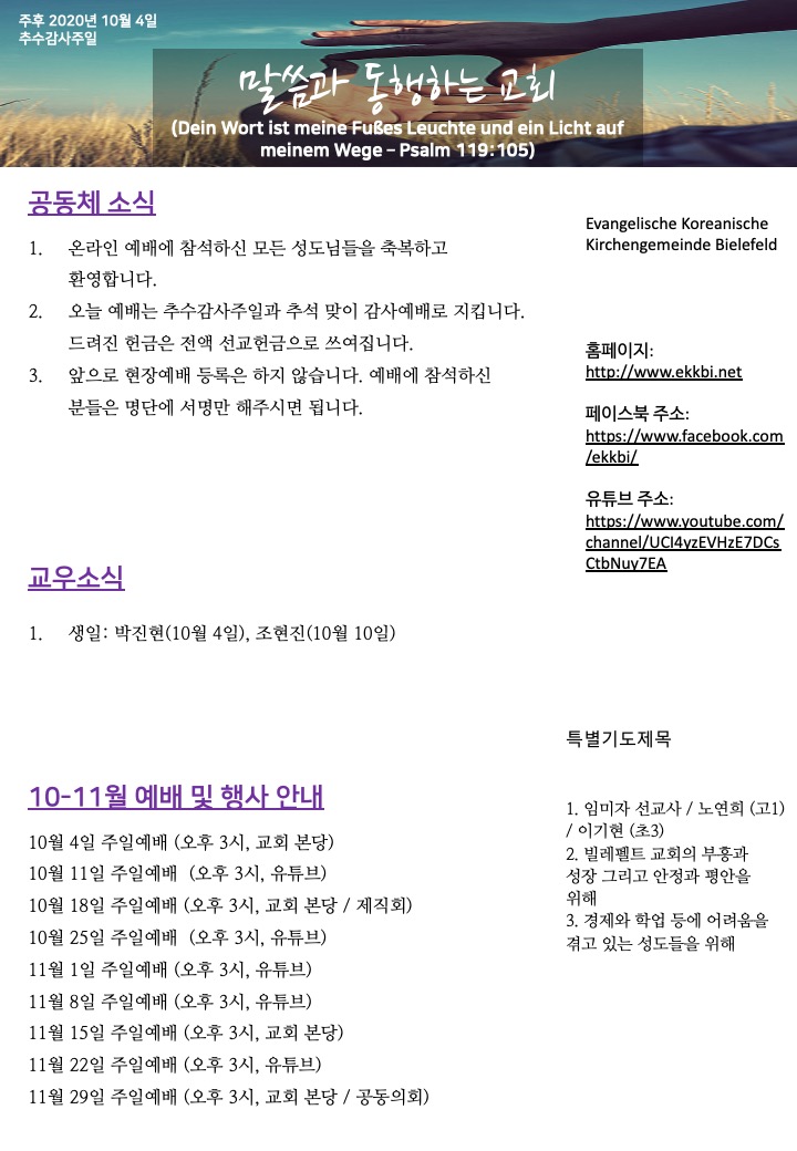 주보 제목2020년 10월 4일 주보입니다.2020-10-03 18:24작성자ekkbi1991내일 주보입니다. 내일은 현장예배로 드리며, 추수감사절이자 추석감사 예배로 드립니다. 내일 드려지는 예물은 전액 선교비로 사용됩니다. 또한 내일부터 예배 참석은 미리 등록하실 필요 없으시고, 오셔서 준비된 명단에 서명만 하시면 되겠습니다^^ 목록글쓰기 이전2020년 10월 11일 주보입니다.ekkbi19912020-10-10다음2020년 9월 27일 주보입니다.ekkbi19912020-09-26 Powered by MangBoard | 망보드 스토어