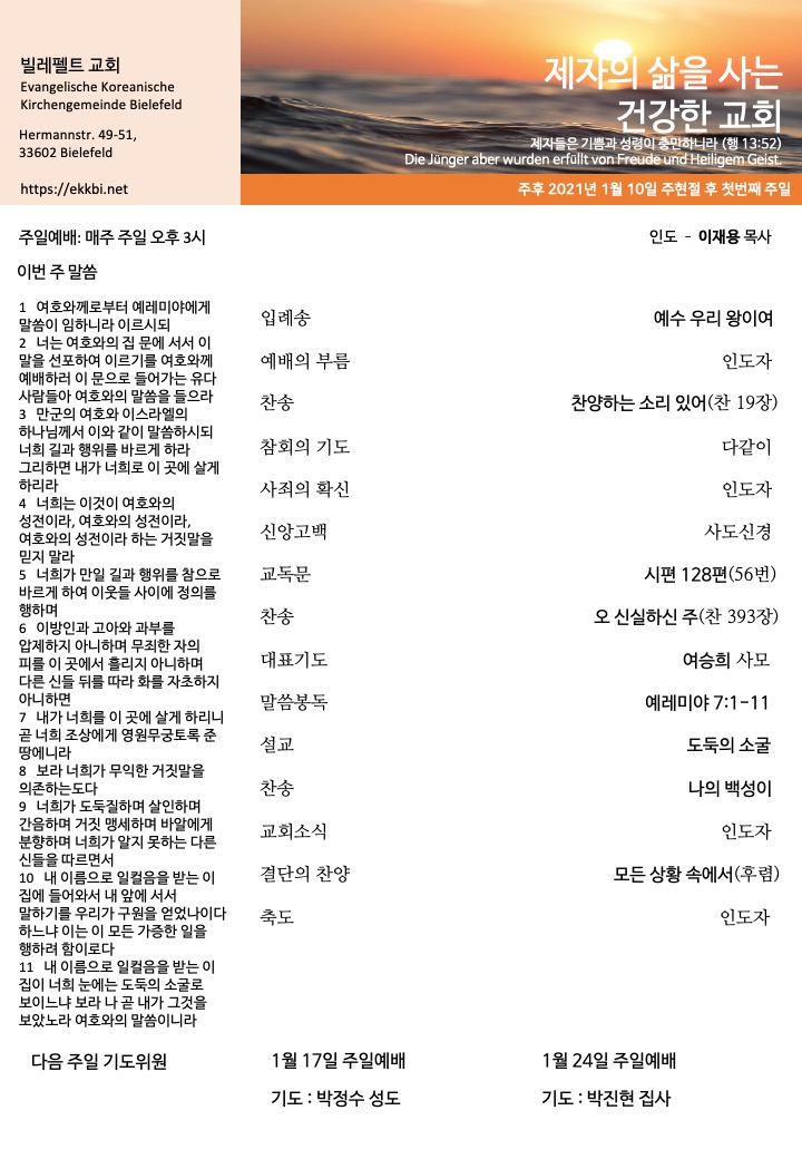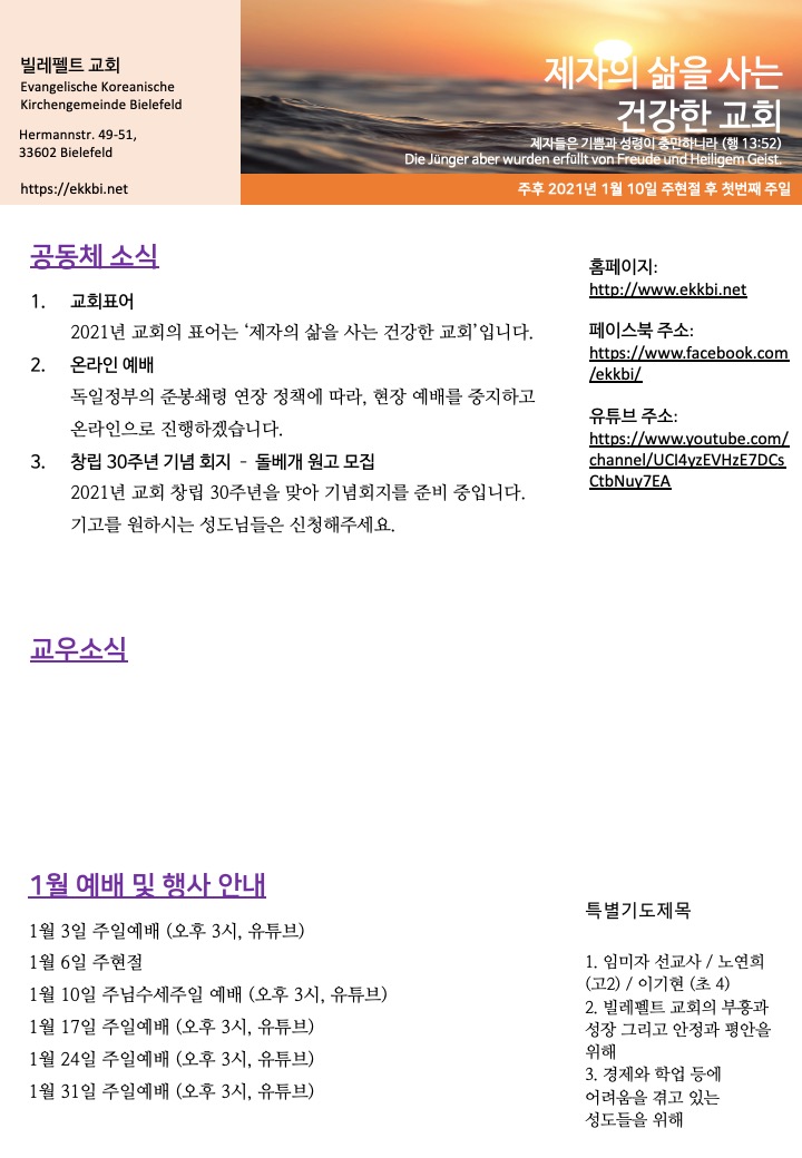 주보 제목2021년 1월 10일 주보입니다2021-01-09 19:17작성자ekkbi1991 목록글쓰기 이전2020년 송구영신예배 순서지입니다ekkbi19912020-12-30다음2021년 1월 17일 주보입니다ekkbi19912021-01-16 Powered by MangBoard | 망보드 스토어